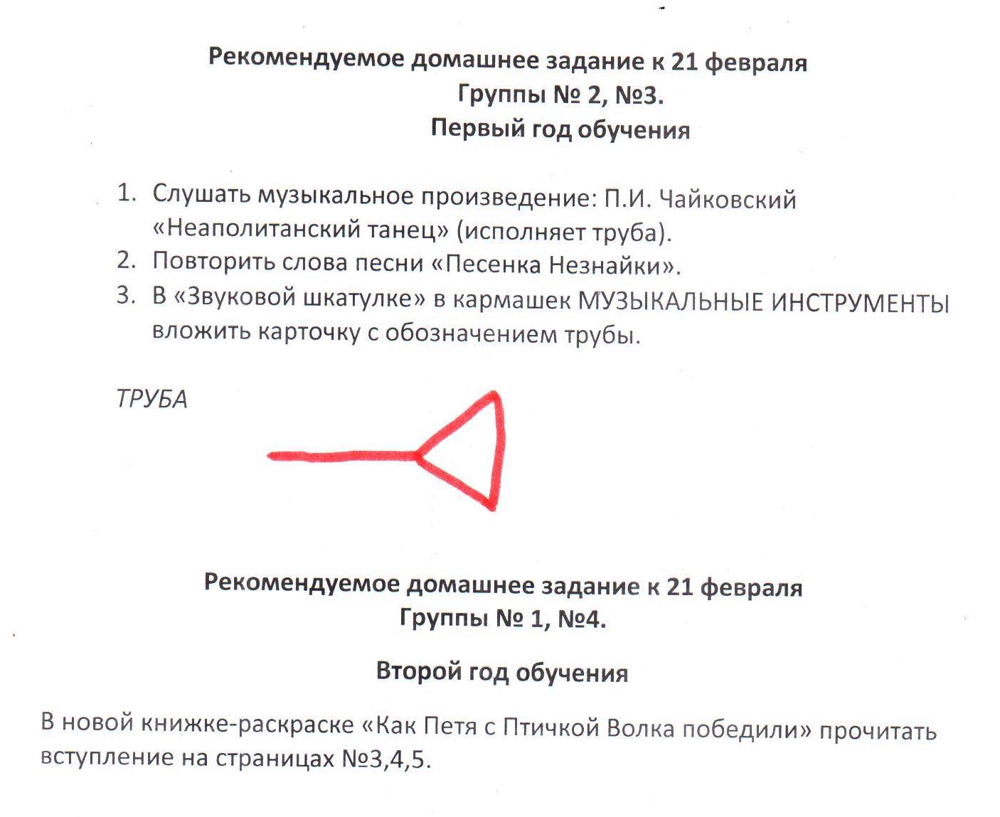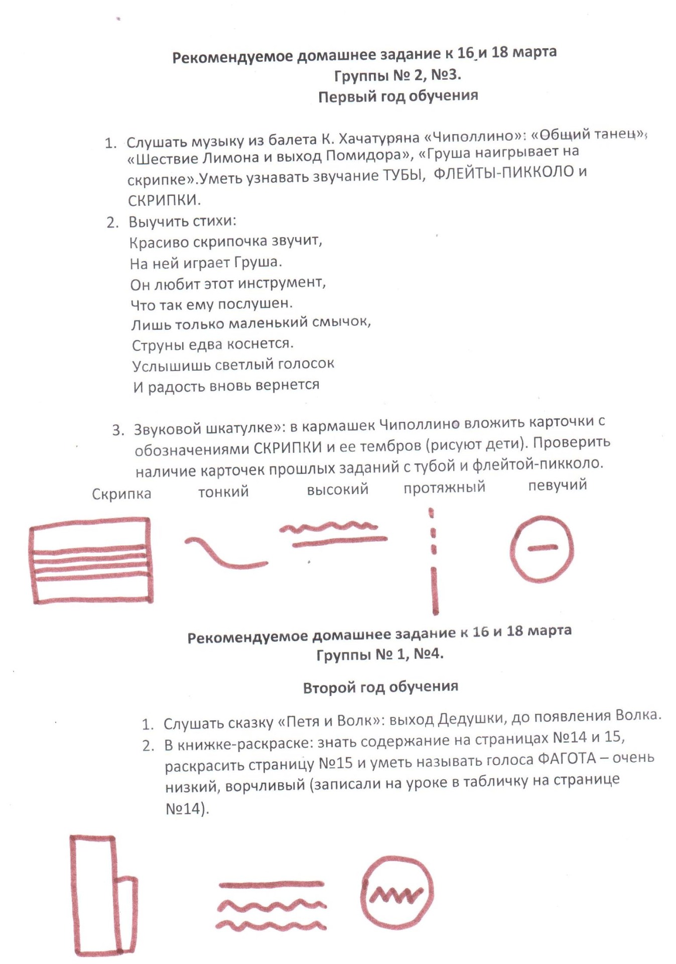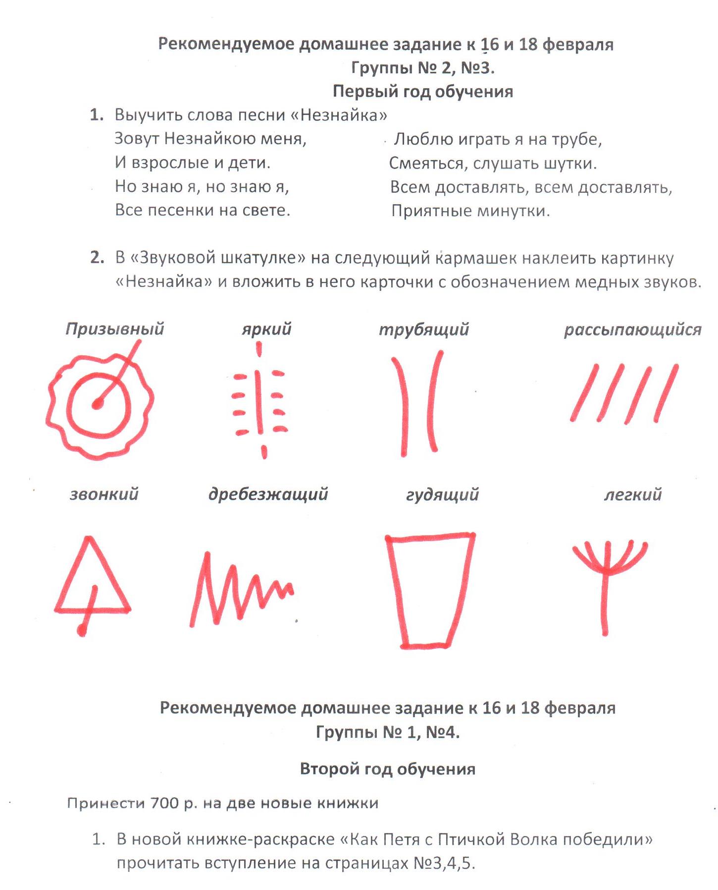 - В книжке-раскраске: знать содержание на страницах №16, 18, 20. Раскрасить страницу №17, 19, 21 и уметь называть голоса ВАЛТОРНЫ – низкий, протяжный, гулкий, яркий (записали на уроке в табличку на странице №16).
